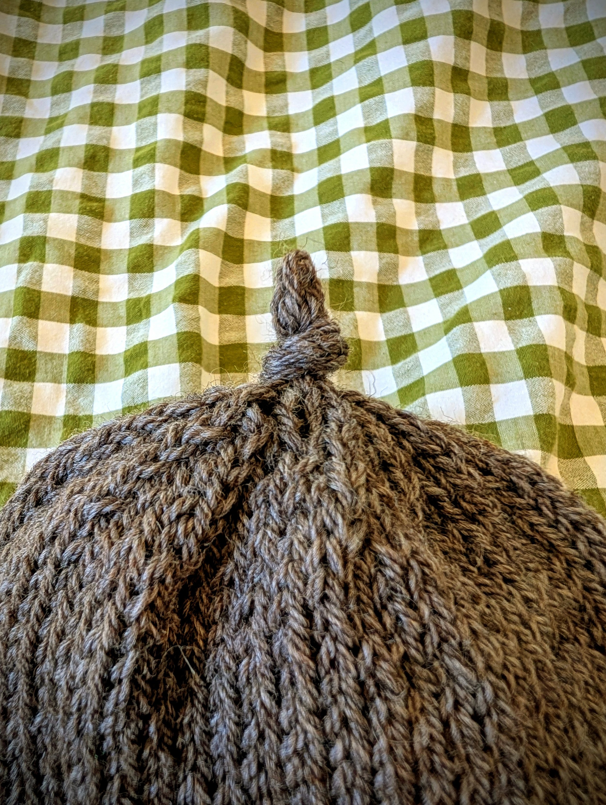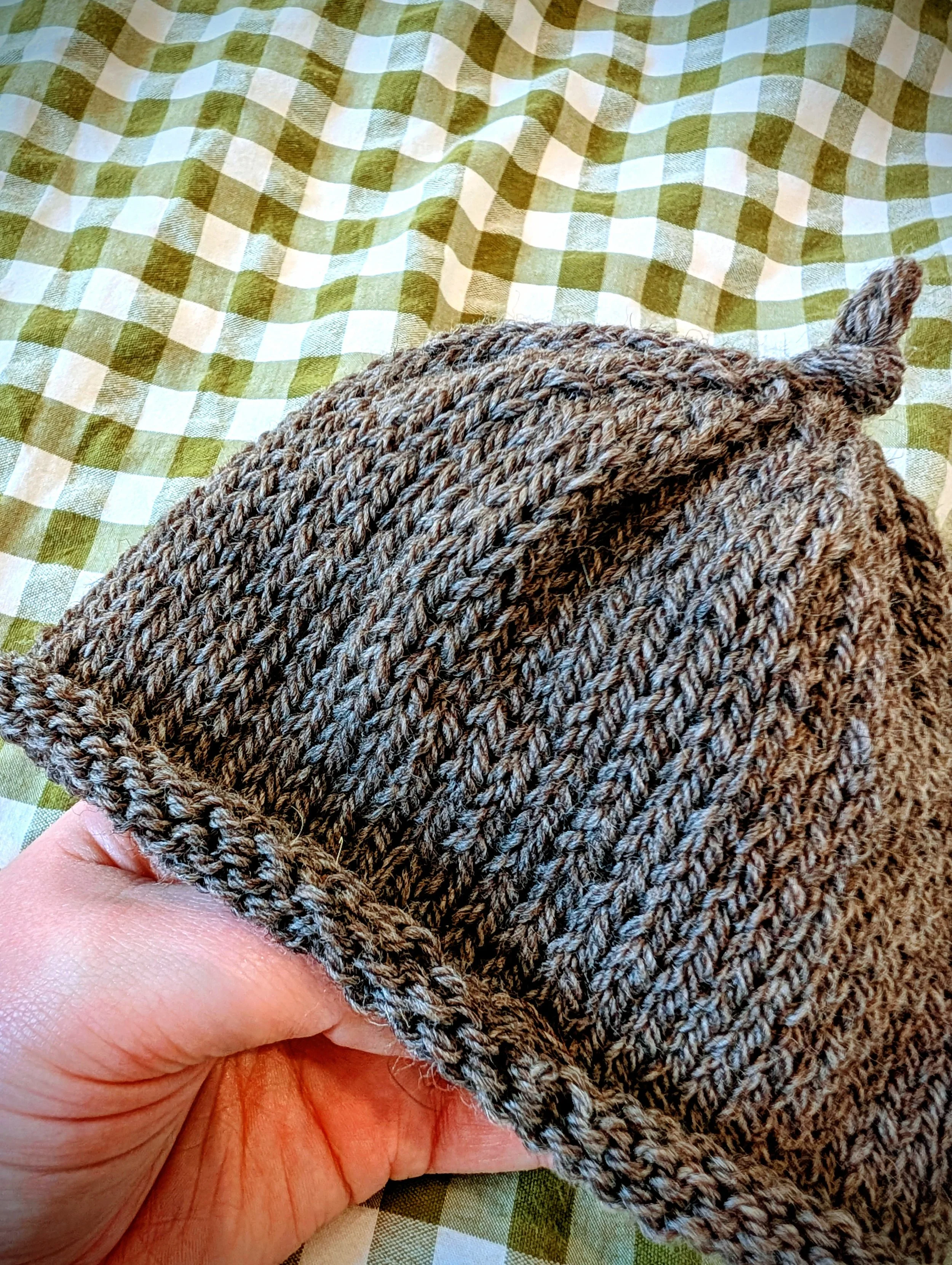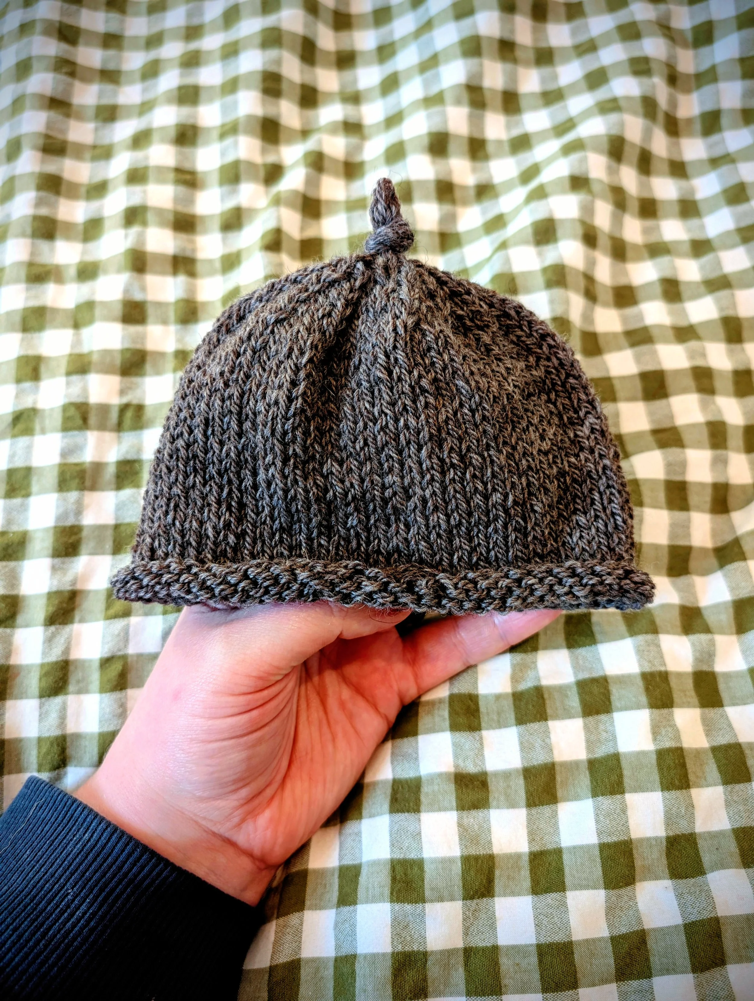 Beautiful greige super soft tie knot top merino wool baby hat.
